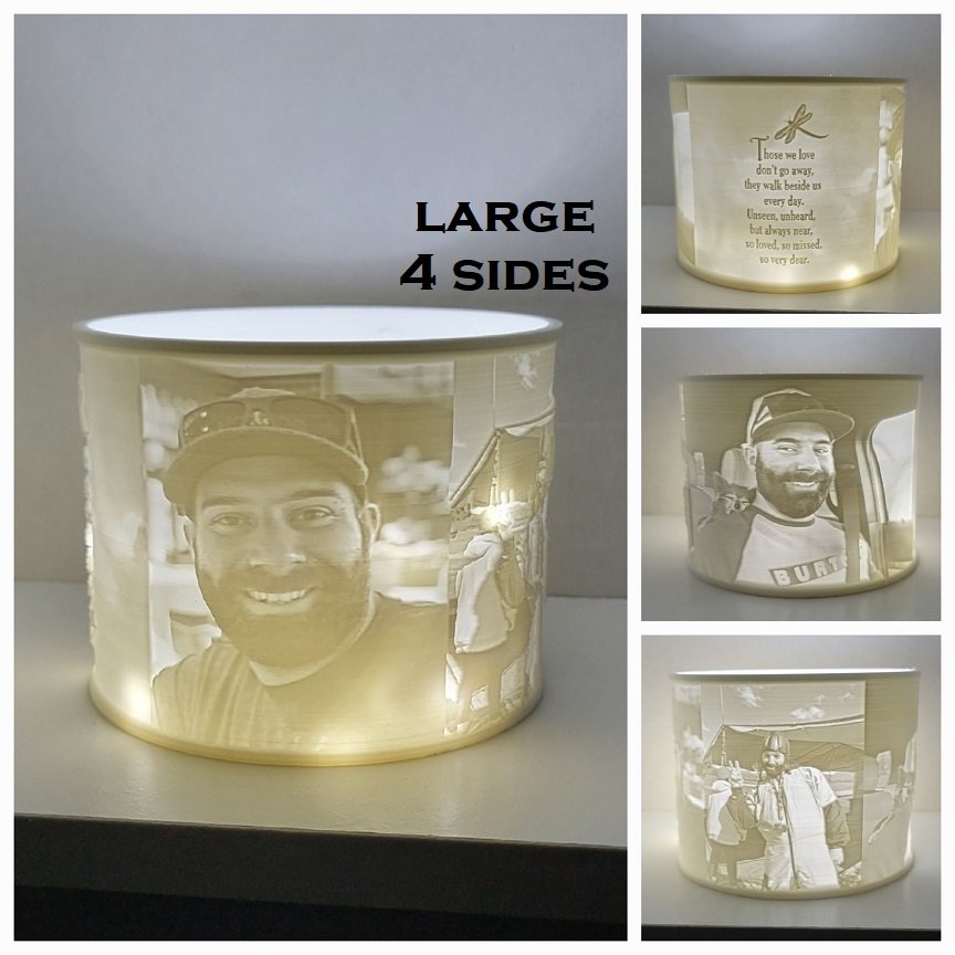 Fill your room with the memory of a loved one with a one of a kind memorial inspired lithophane votive holder. For electric candle light use only. NO real flames.
